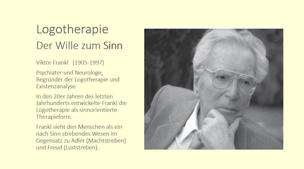 Viktor Frankl sieht uns Menschen als Wesen, die nach Sinn streben. Sein anthropologisch-philosophisches Menschenbild basiert auf den Annahmen, dass wir Menschen nicht “frei von” sondern “frei zu” in unserem Handeln sind. Die eigene Orientierung zu sinnvoller Lebensgestaltung fordert uns, verantwortliche Entscheidungen zu treffen. Nicht wir stellen Fragen an das Leben, sondern das Leben stellt Fragen an uns, die es gilt, sinnvoll zu beantworten.